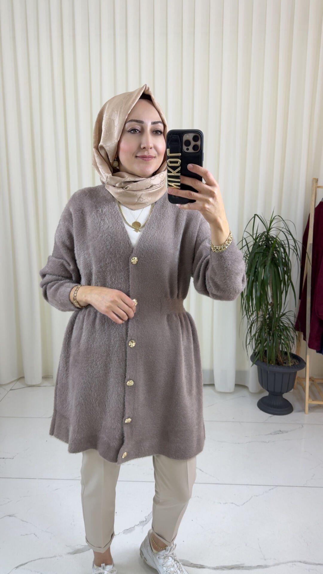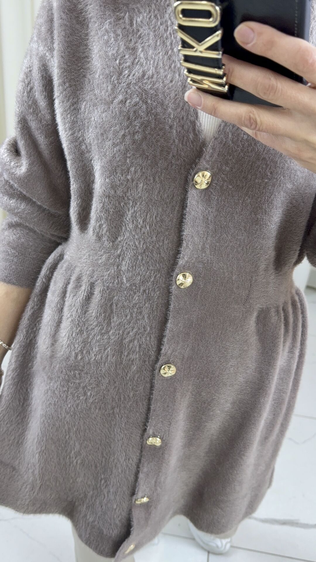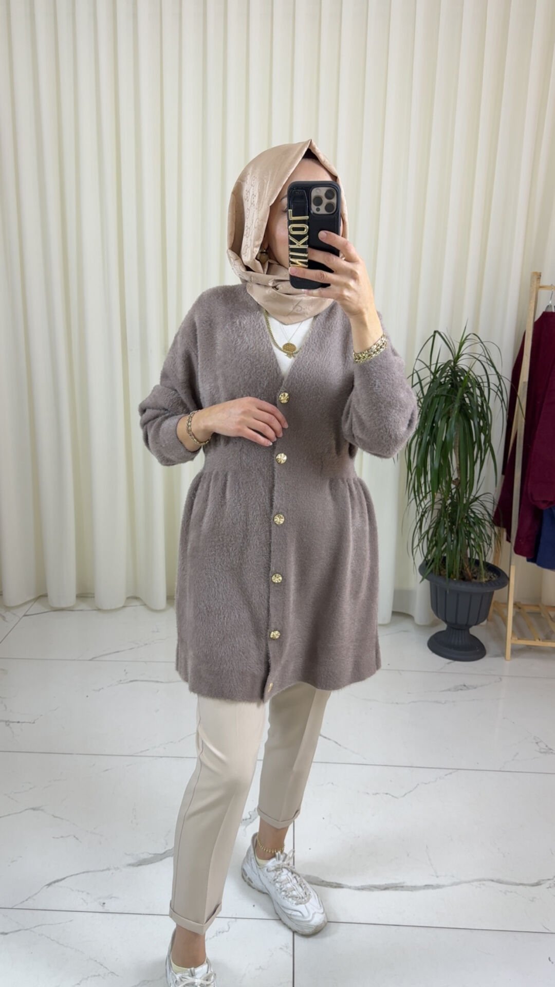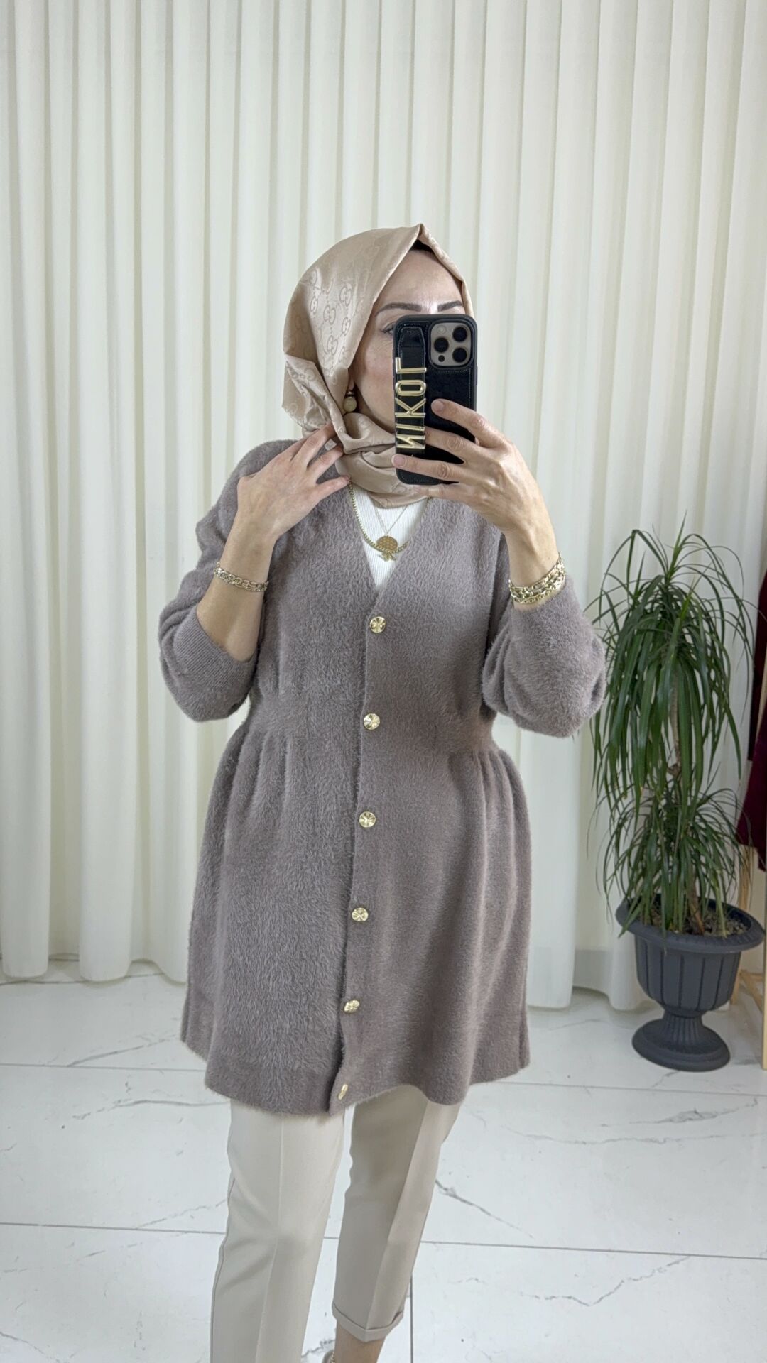 Sıcak tutan yumuşacık dokusuyla dikkat çeken Angora hırka, şıklığı ve rahatlığı bir arada sunuyor. Gold düğme detaylarıyla modern bir tarz yakalarken, standart bedeni sayesinde 36-44 arası uyum sağlar. Diz üstü boyuyla hem elbiseler hem de pantolonlarla kolayca kombinlenebilir.