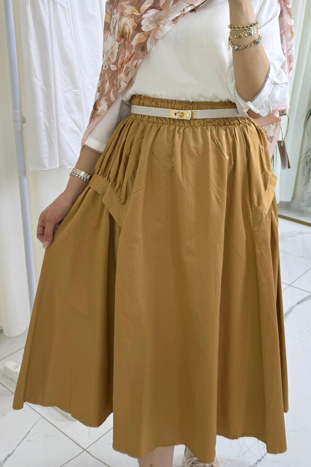 Beli Lastikli Yan Detaylı Etek - Camel