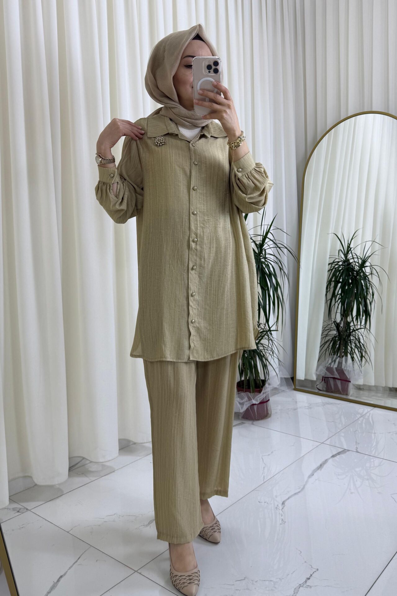 Krinkle Kumaş Broş Detaylı İkili Takım