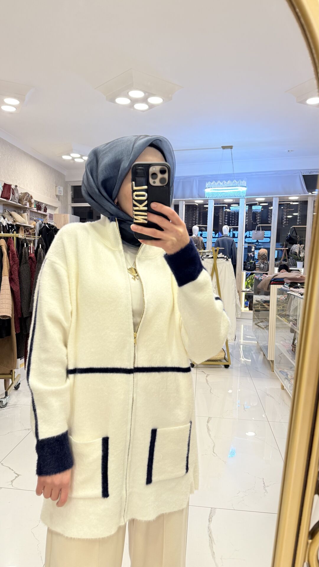 - Kırık beyaz zemin üzerine lacivert şerit detaylarıyla modern bir görünüm kazandırır.