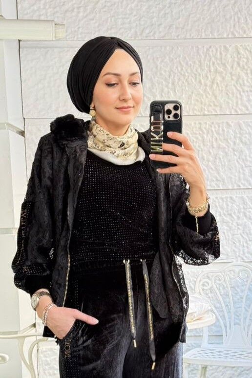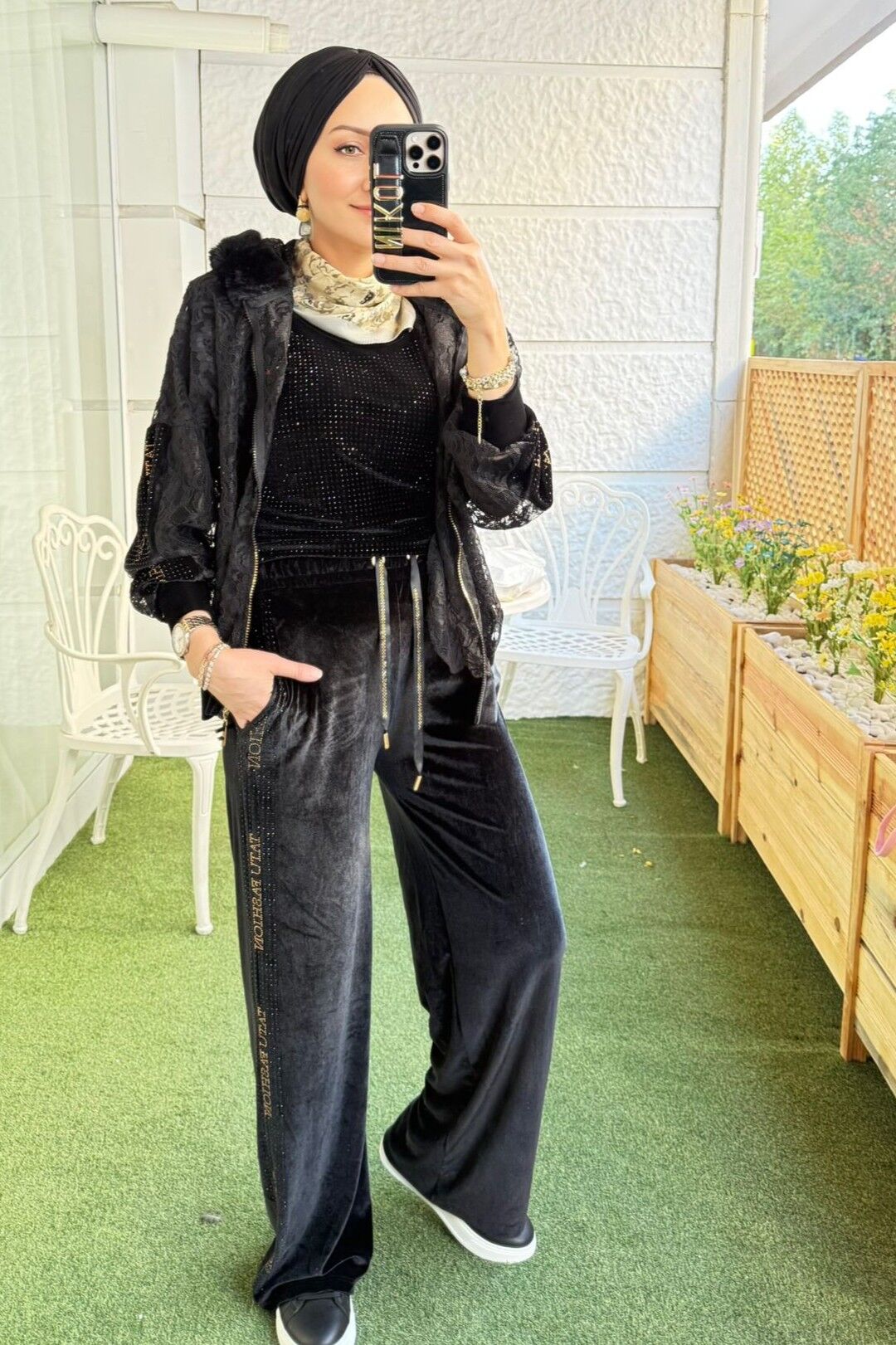 Fisto Ceketli Işıltılı Üçlü Eşofman Takım - Siyah