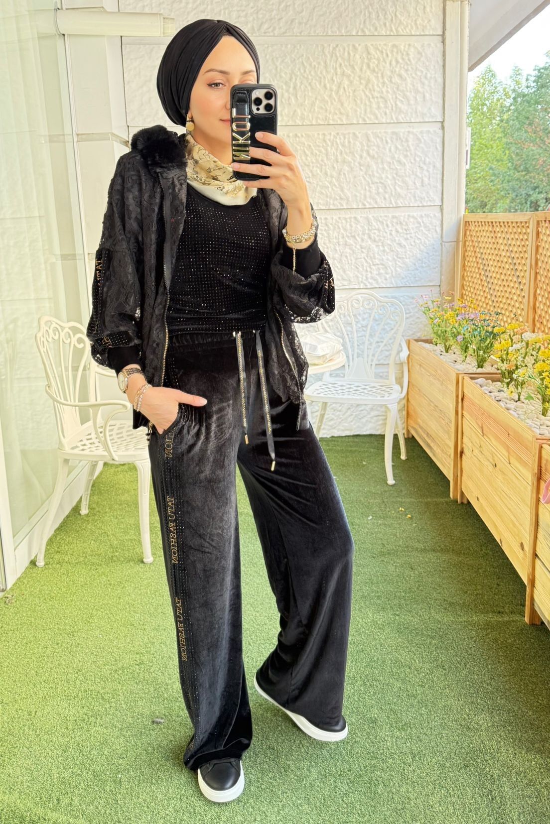 Kadife Kumaş Fisto Ceketli Üçlü Eşofman Takımı