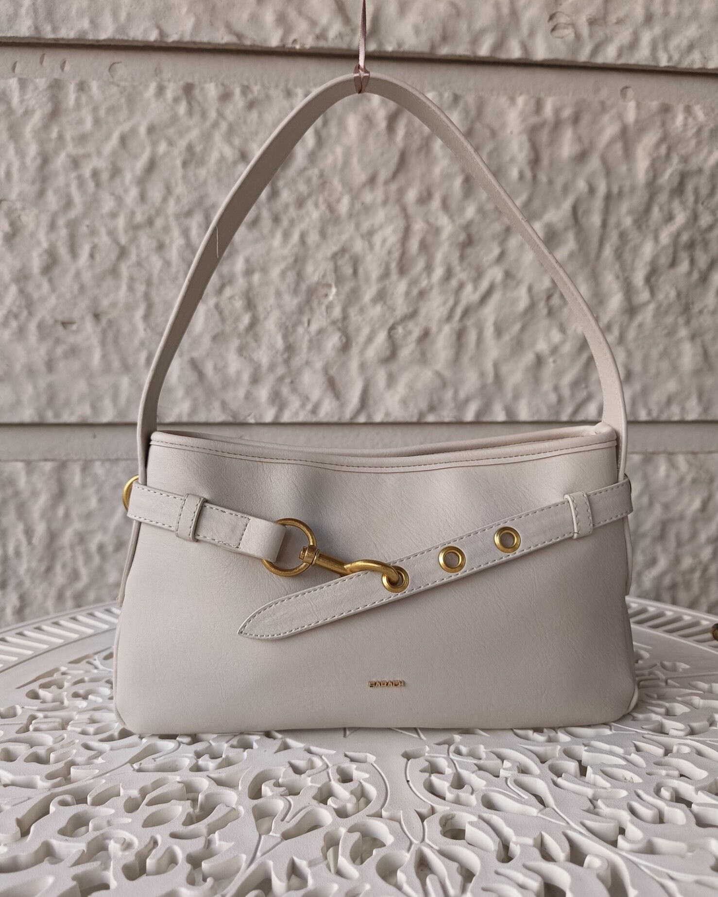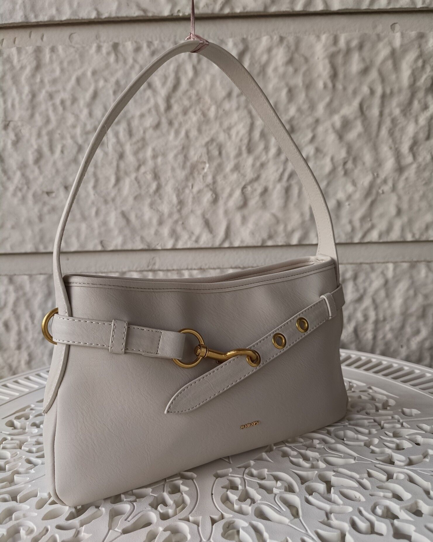 Göz alıcı metal tokası ve kemer detaylarıyla öne çıkan bu bej rengi omuz çantası, klasik çizgilere modern bir yorum katıyor. Mat suni deri yüzeyi, yarı yumuşak dokusu ve altın rengi aksesuarlarıyla şıklığı ve sadeliği mükemmel şekilde bir araya getiriyor.