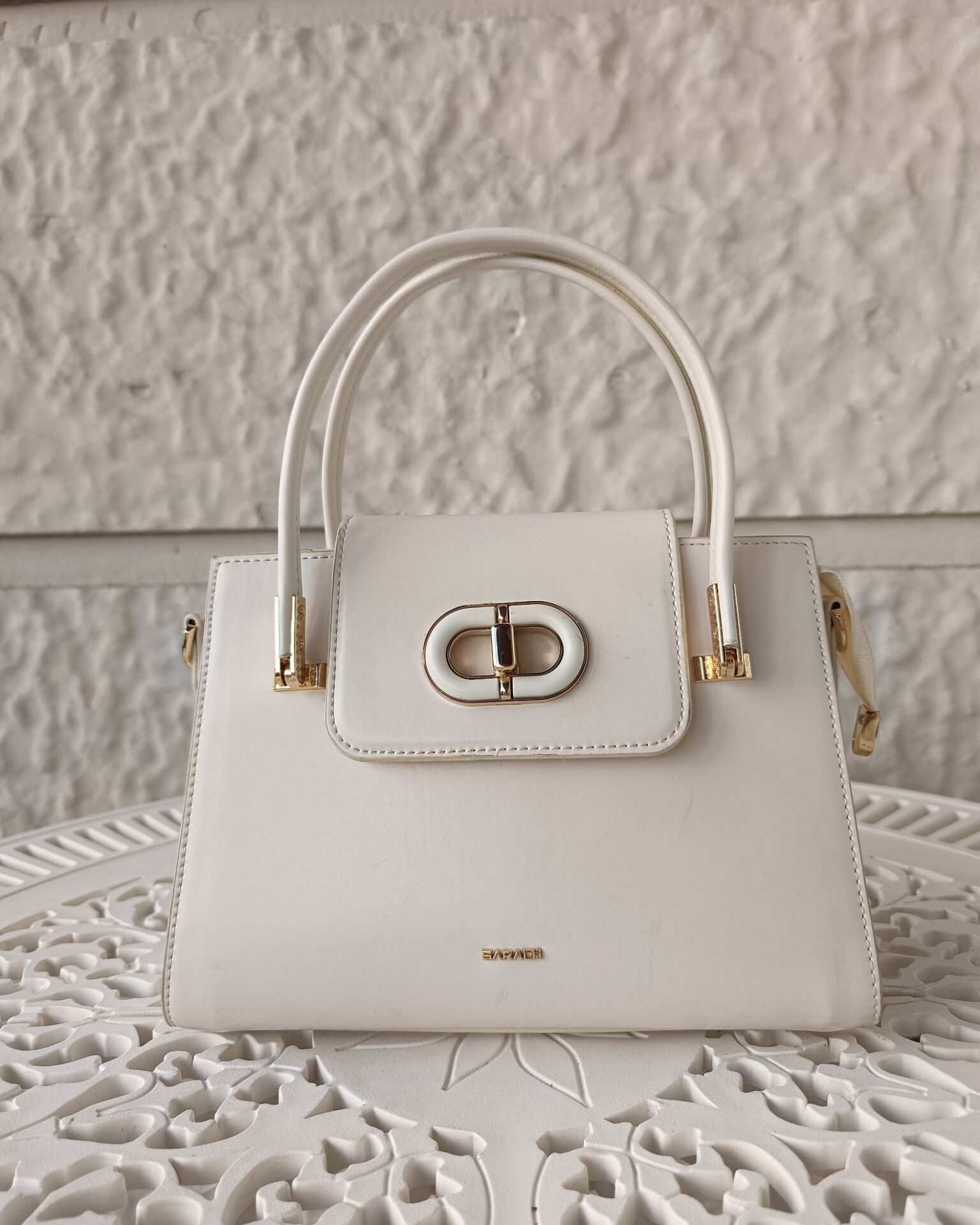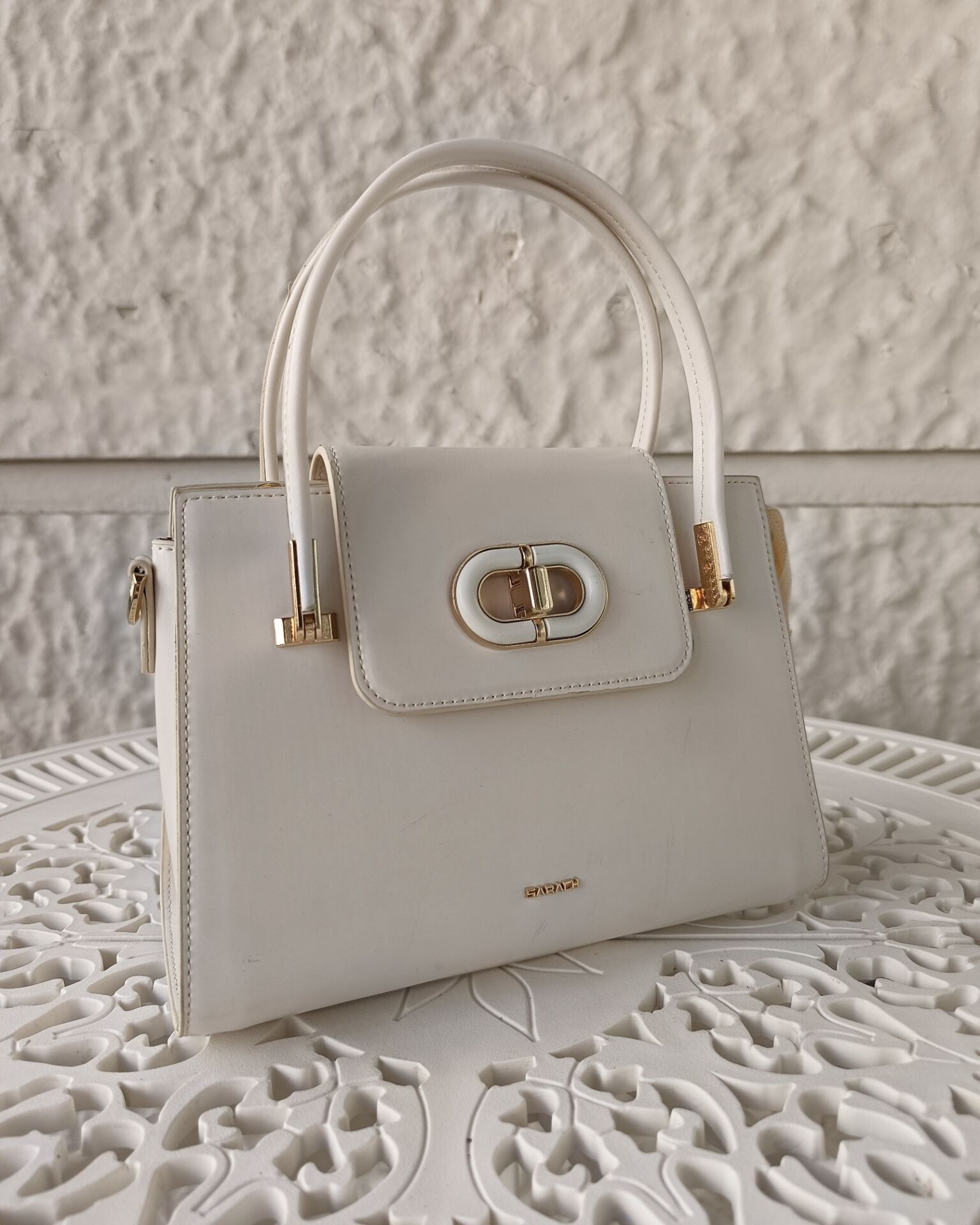Klasik ve modern tasarımı bir araya getiren bu bej el çantası, altın rengi metal detayları ve tokasıyla sofistike bir görünüm sunuyor. Kusursuz dikişleri ve pürüzsüz yüzeyi ile yüksek kaliteli işçiliği yansıtan bu çanta, hem şık davetlerde hem de günlük kombinlerde rahatlıkla kullanılabilir.