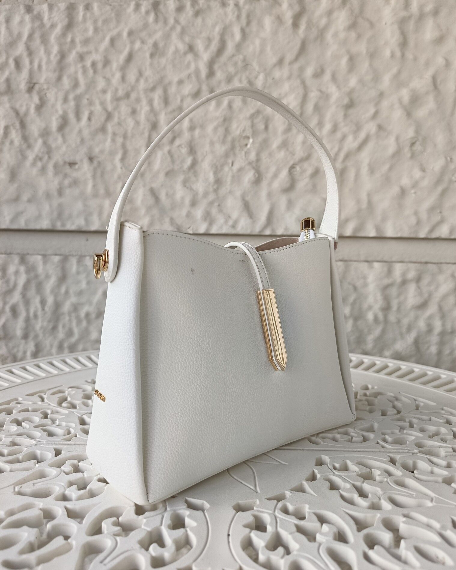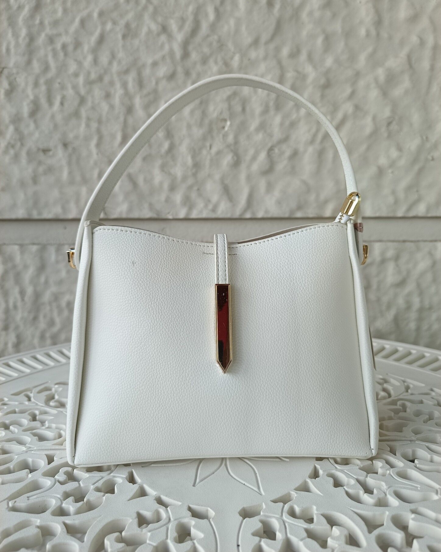 Sadelikten gelen zarafeti yansıtan bu beyaz omuz çantası, minimal tasarımı ve zarif hatlarıyla modern stilin vazgeçilmez parçalarından biri. Düz yapısı ve altın metal detaylı kapama tokası ile dikkat çeken bu model, her kombine uyum sağlayacak kadar sade ama etkileyici. Yumuşak dokulu suni deri yüzeyi ve şık sap tasarımı sayesinde hem günlük kullanımda hem özel günlerde rahatlıkla tercih edilebilir.