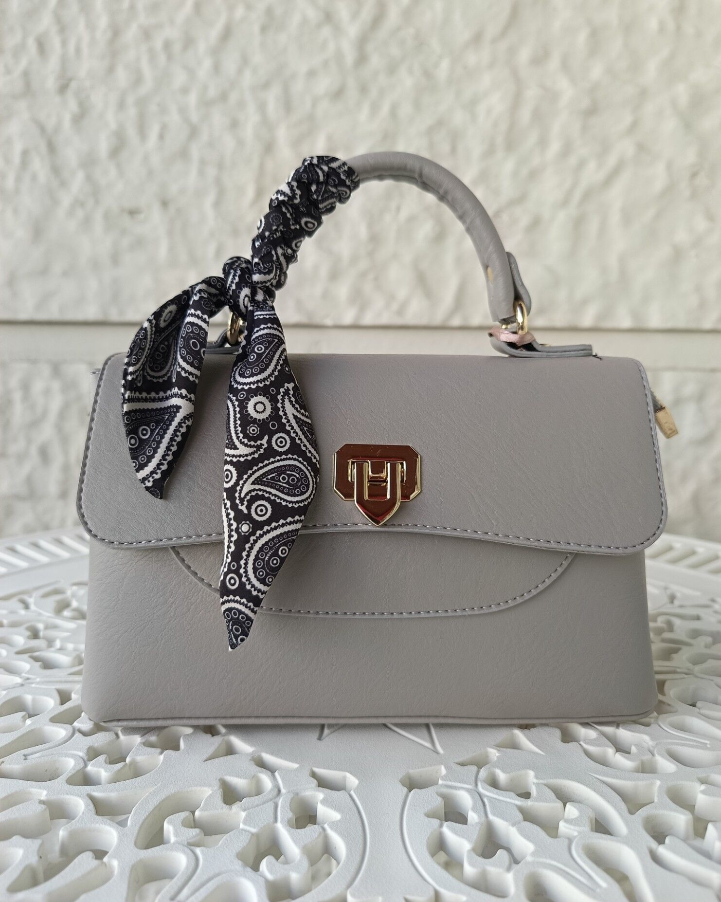 Şıklığın zarif bir yorumu olan bu gri el çantası, minimal tasarımı ve dikkat çekici desenli şal detayı ile öne çıkıyor. Altın renkli kilit aksesuarı ve modern hatlarıyla klasik tarzı yeniden yorumluyor. Yumuşak dokulu malzemesi ve geniş iç hacmi sayesinde hem günlük hem de özel anlarınızda yanınızda taşıyabileceğiniz fonksiyonel bir çanta. Elde taşımaya uygun sap tasarımına ek olarak omuz askısı ile farklı kullanım imkanı da sunuyor.