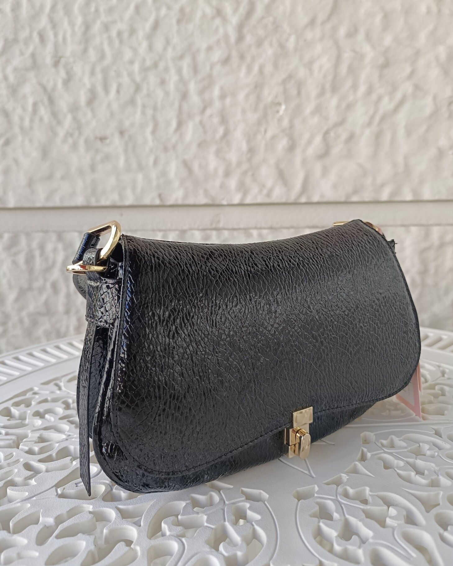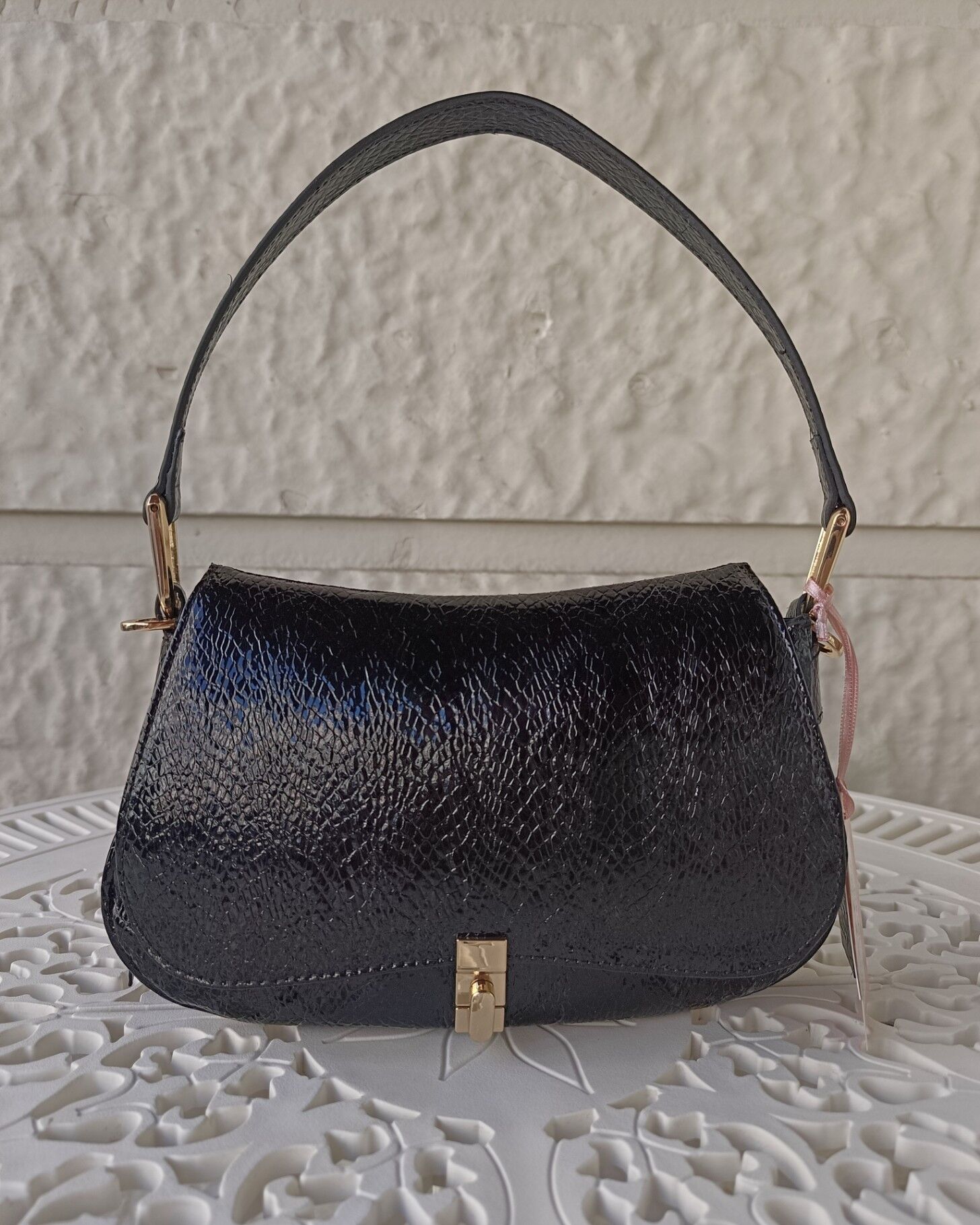 Göz alıcı rugan dokusu ve zarif tasarımıyla bu siyah el çantası, şıklığınızı tamamlayacak en özel parçalardan biri. Işıltılı yüzeyi ve altın rengi metal kilidi sayesinde hem klasik hem de modern tarzlara hitap eder. K Kısa sapı sayesinde elde taşınabilirken, istenirse askı takılarak omuzda da kullanılabilir.