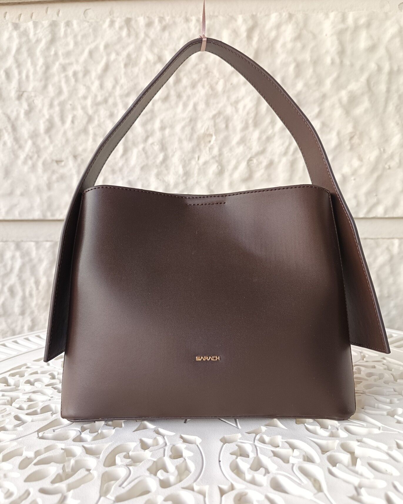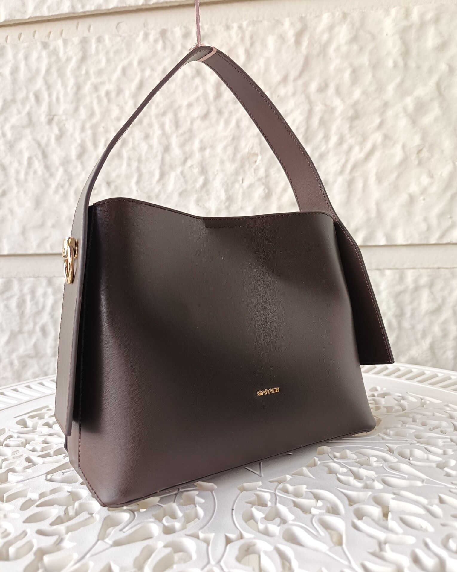 Minimal çizgileri ve güçlü duruşuyla öne çıkan bu koyu kahverengi omuz çantası, sade ama etkileyici bir stil sunuyor. Mat dokulu, yüksek kaliteli deri yüzeyiyle hem dayanıklılığı hem de lüks hissi bir araya getiriyor. Geniş iç hacmi ve sağlam yapısı sayesinde günlük kullanım için ideal olan bu model, altın renkli zarif marka logosuyla şıklığını tamamlıyor. Ofisten akşam yemeğine geçişlerde stilinizi zahmetsizce tamamlayacak bir parça arıyorsanız, bu çanta sizin için.