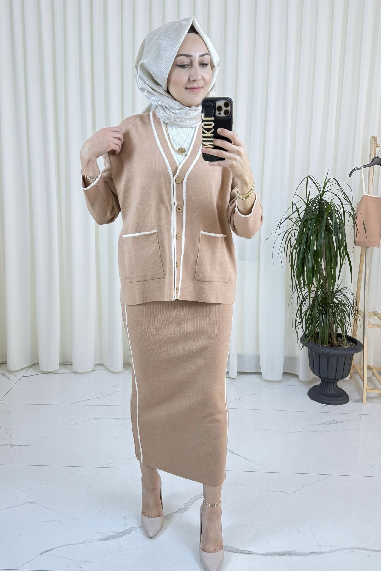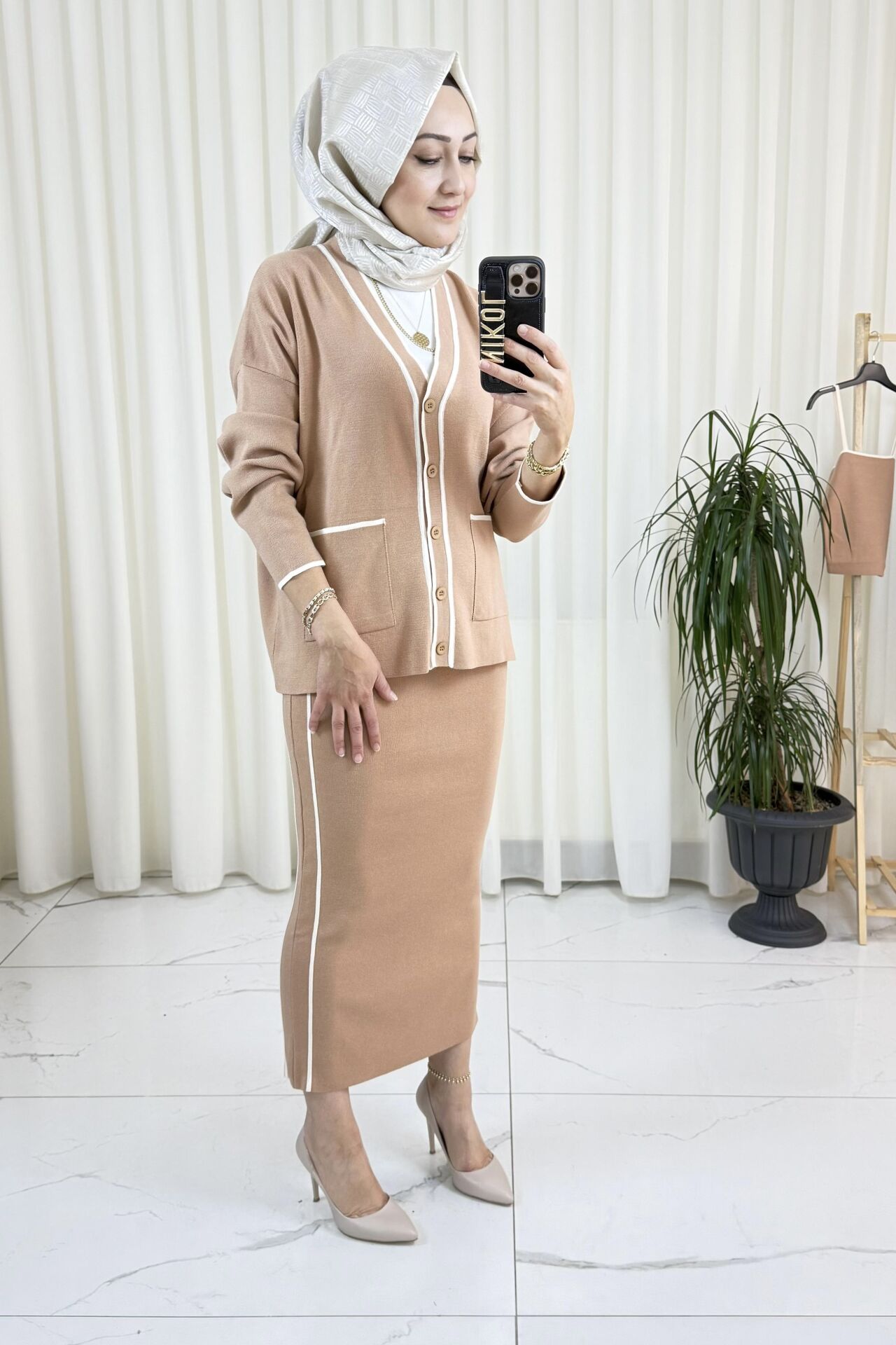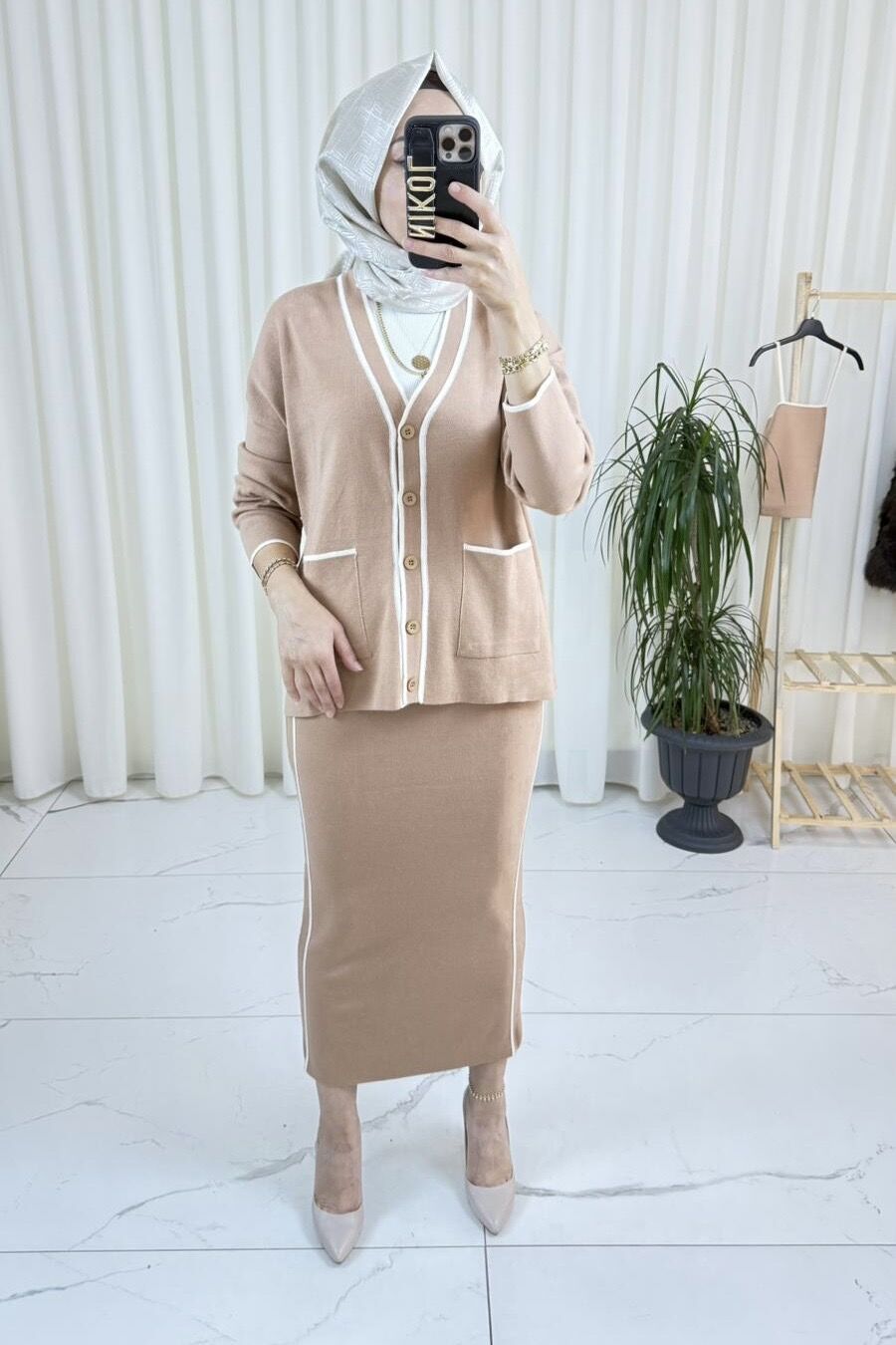 Zarif çizgiler, soft renkler ve konforlu şıklık bir arada! Vizon tonlarında üçlü takım, ister günlük ister özel davet kombinlerinizde stilinizi öne çıkarıyor. Modern duruşuyla gardırobunuzun favorisi olacak.